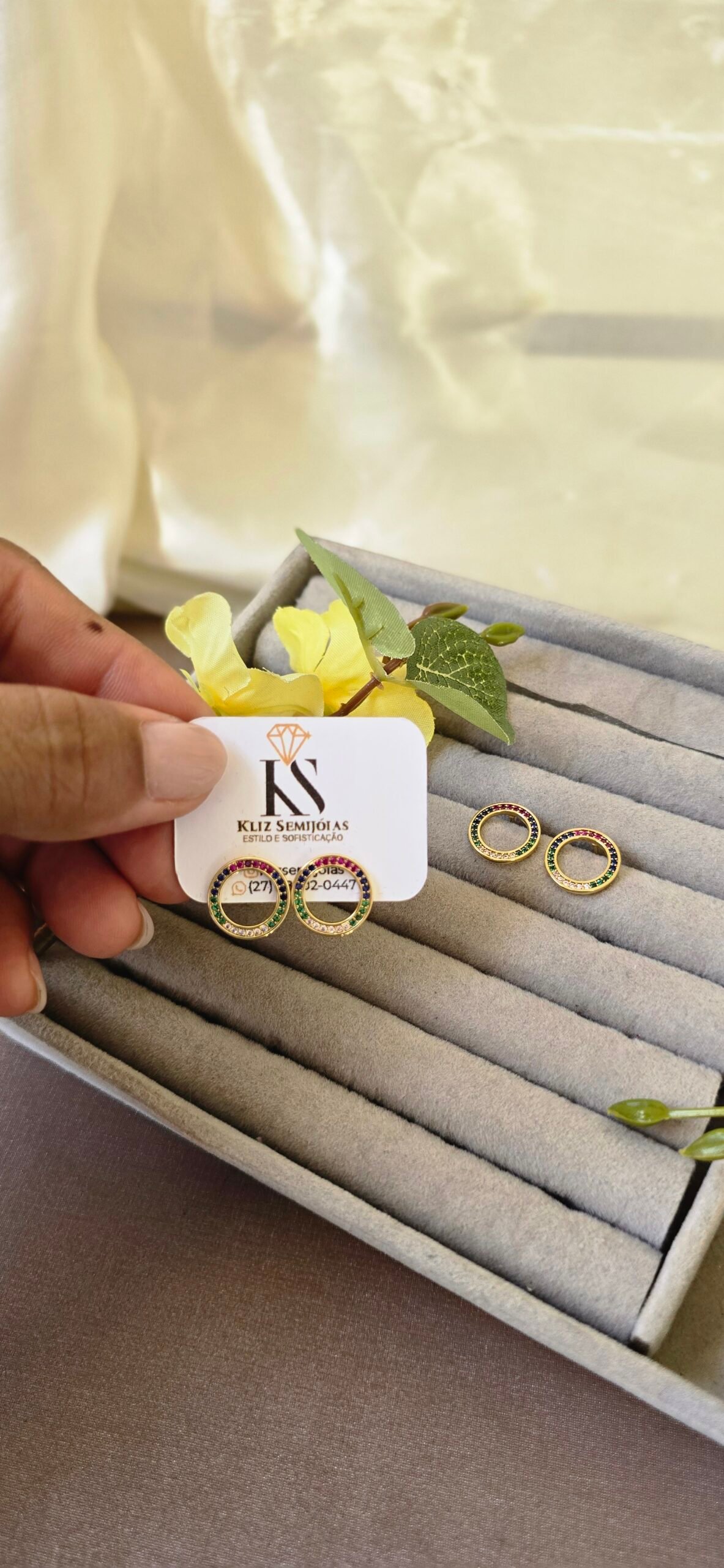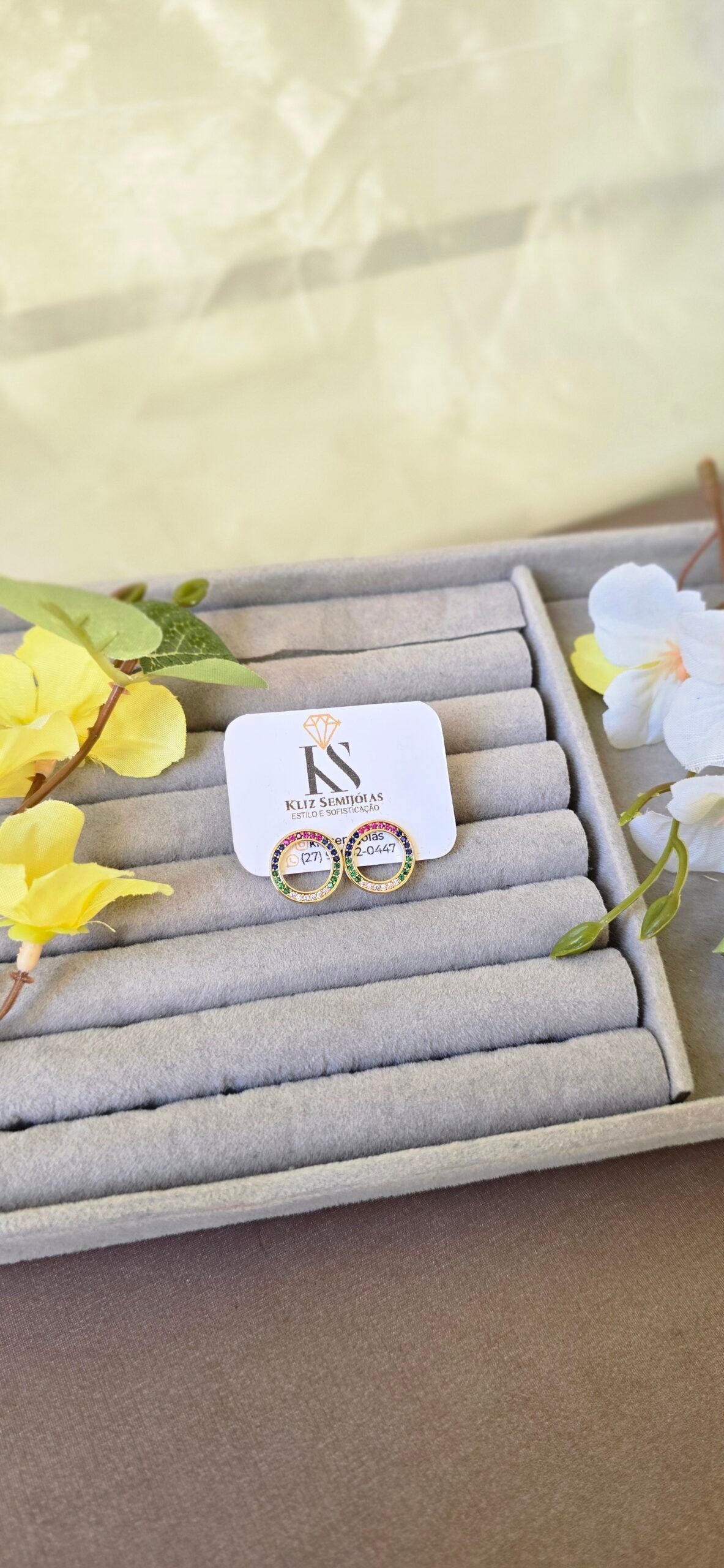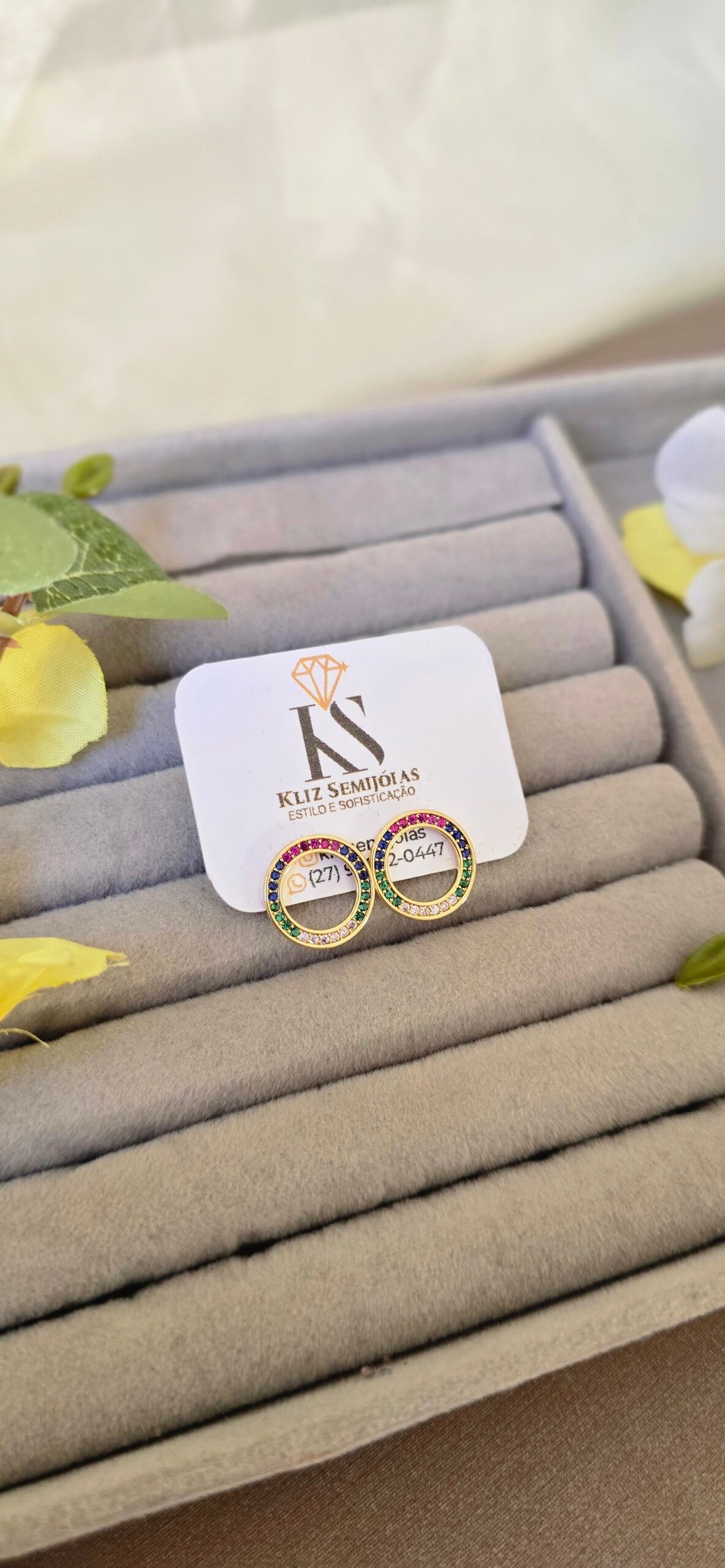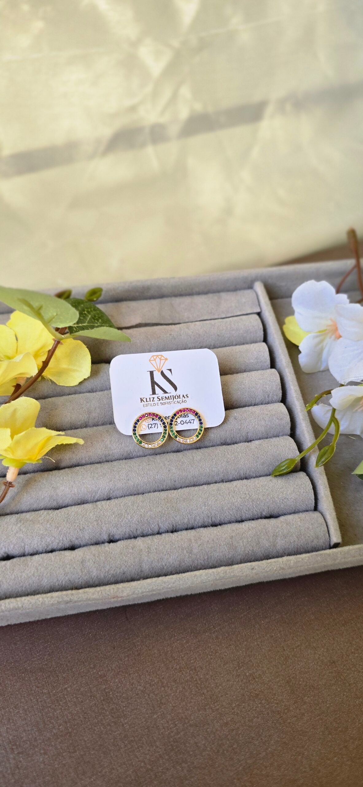É a definição perfeita de elegância com um toque de personalidade. Seu design delicado em formato circular, cravejado com zircônias multicoloridas, cria um efeito luminoso e sofisticado que valoriza qualquer produção.