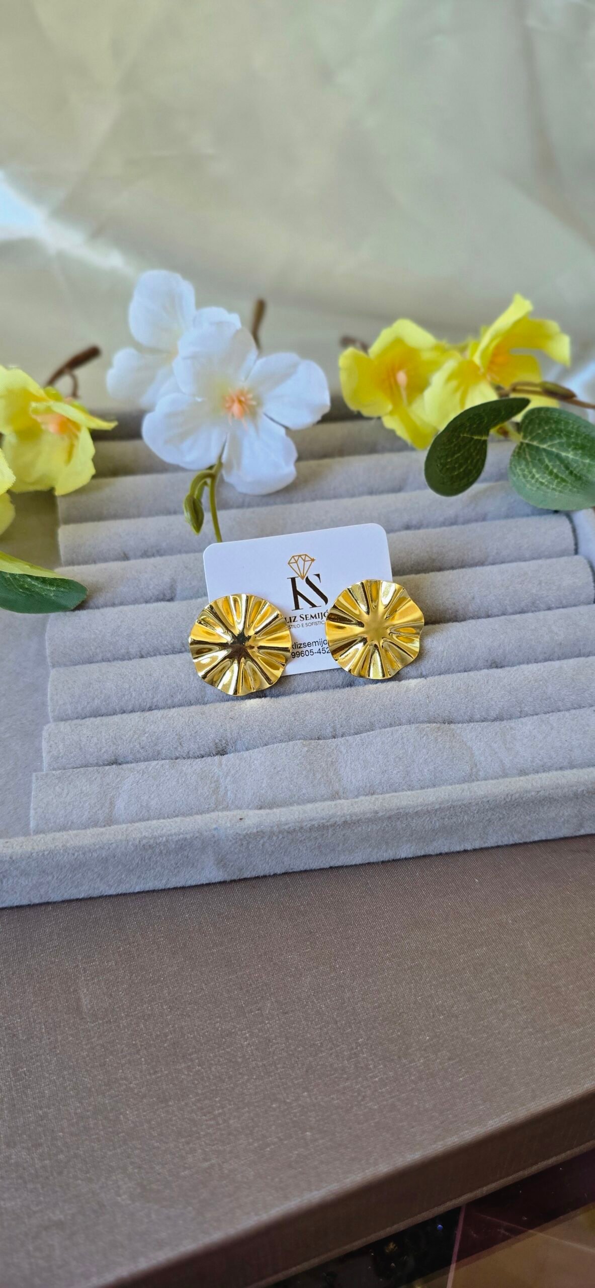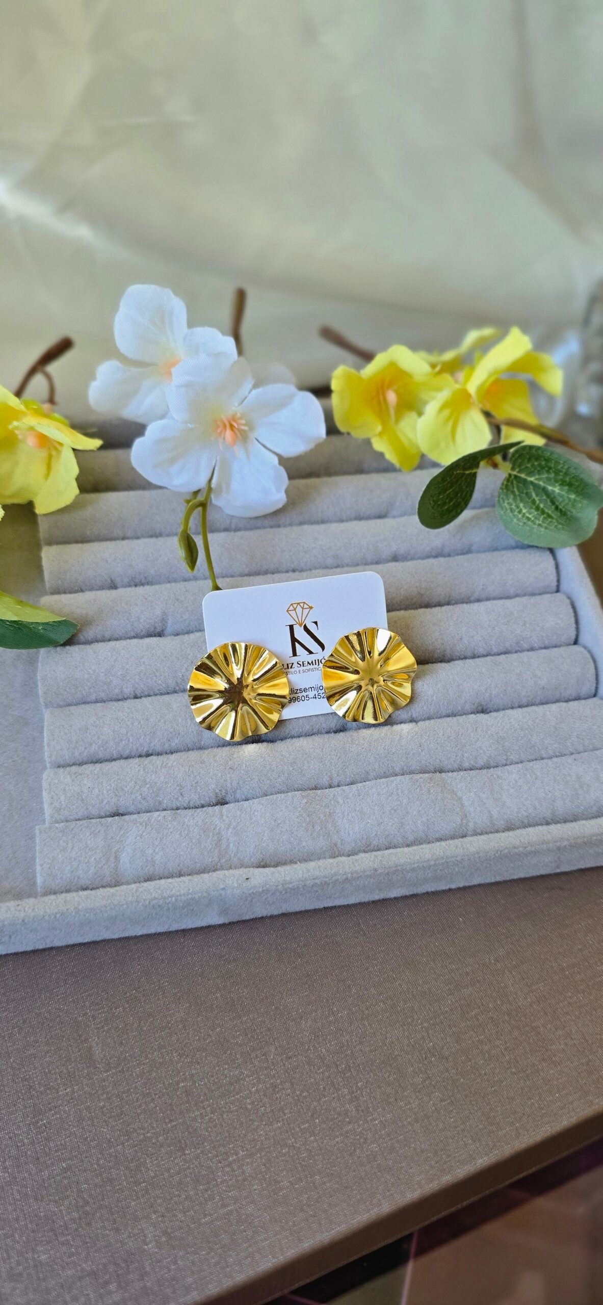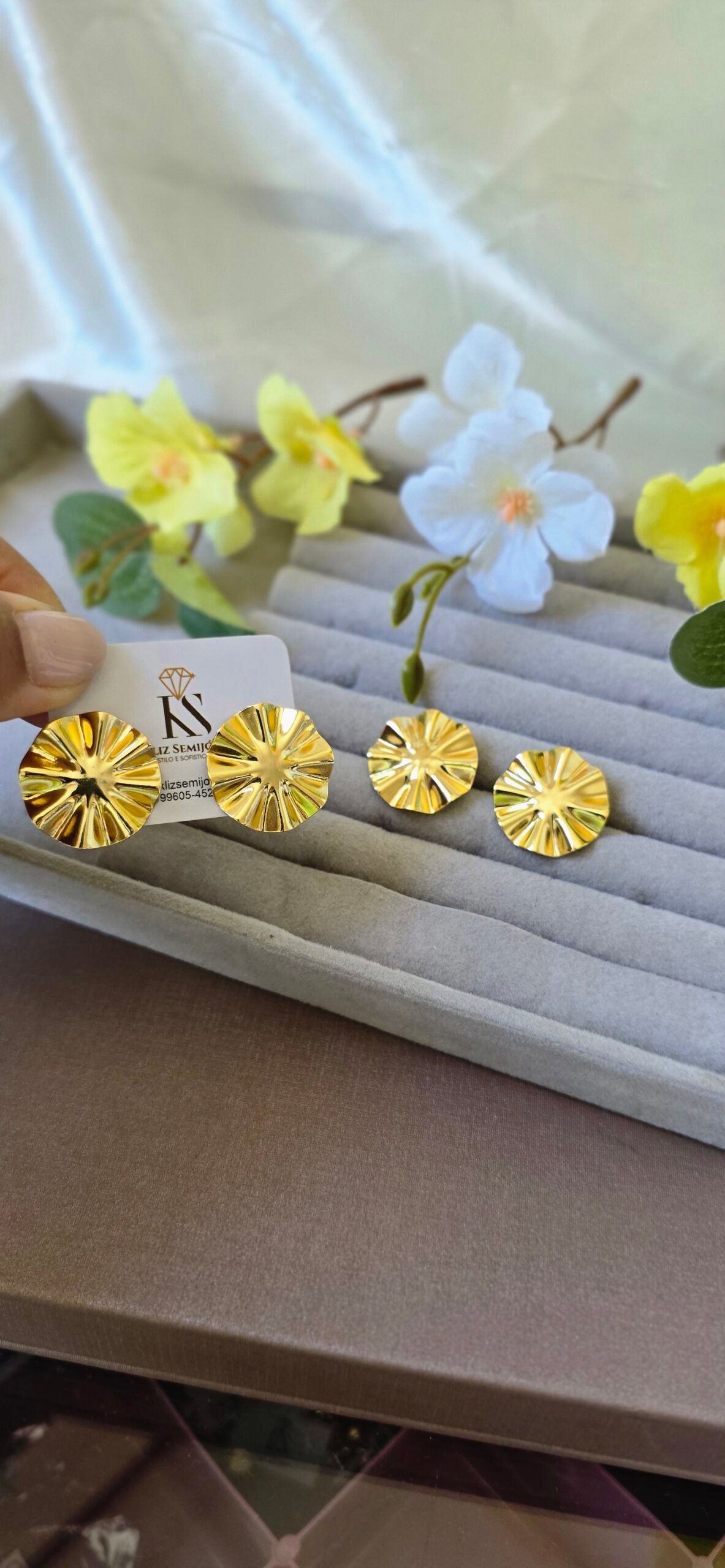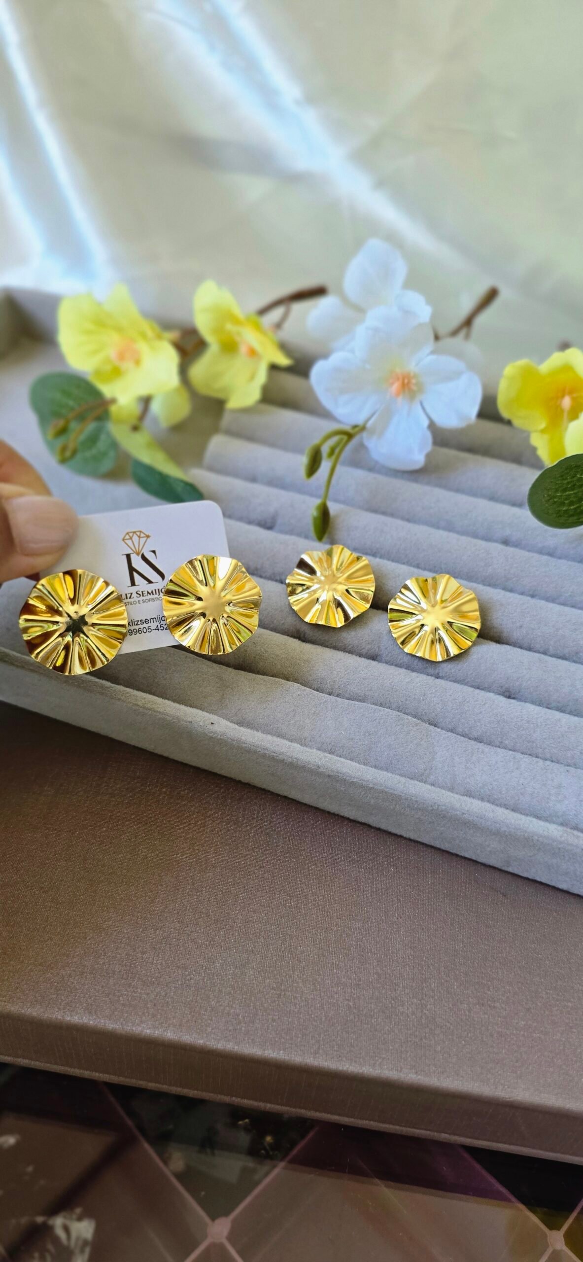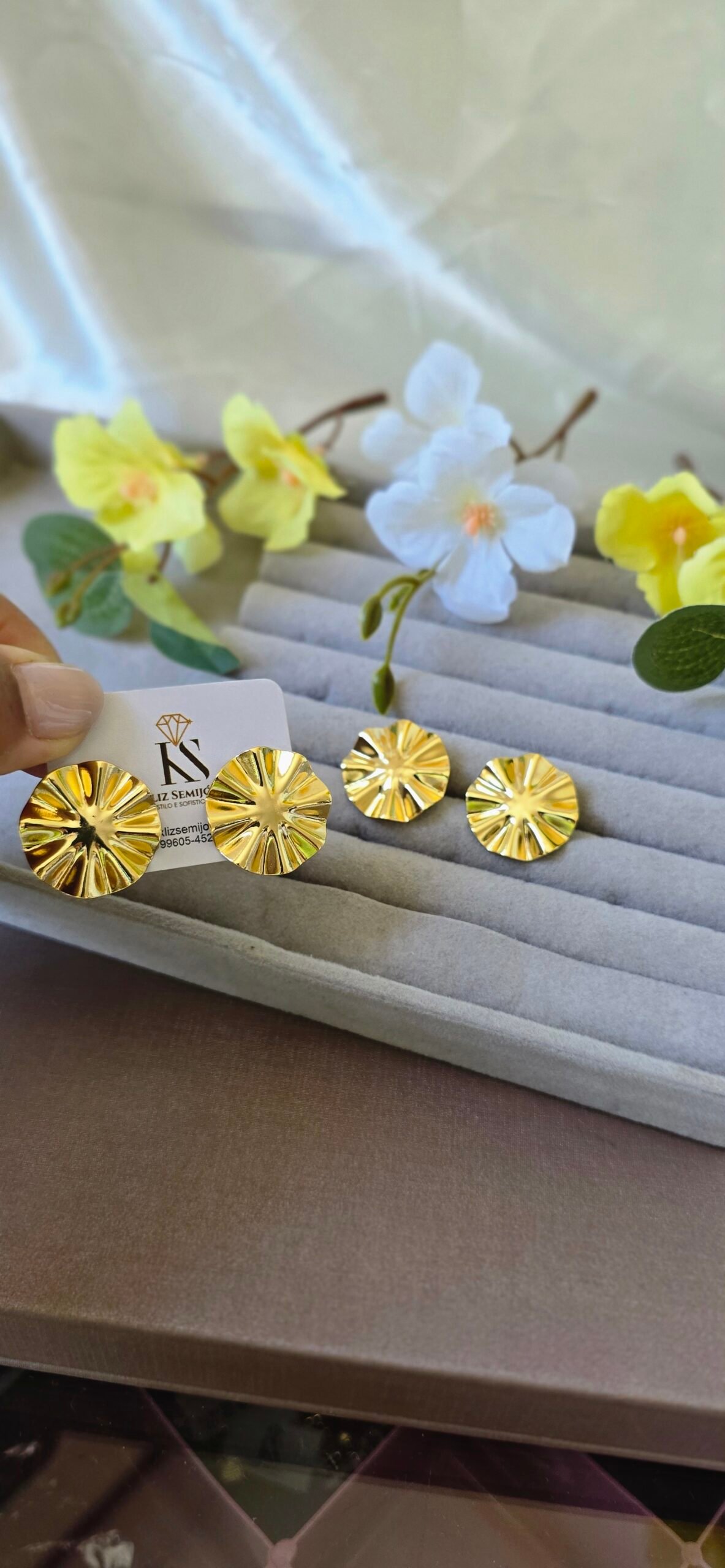 Com formato arredondado e textura marcante, ele une delicadeza e presença, sendo perfeito para iluminar produções do dia a dia ou compor looks mais elegantes.