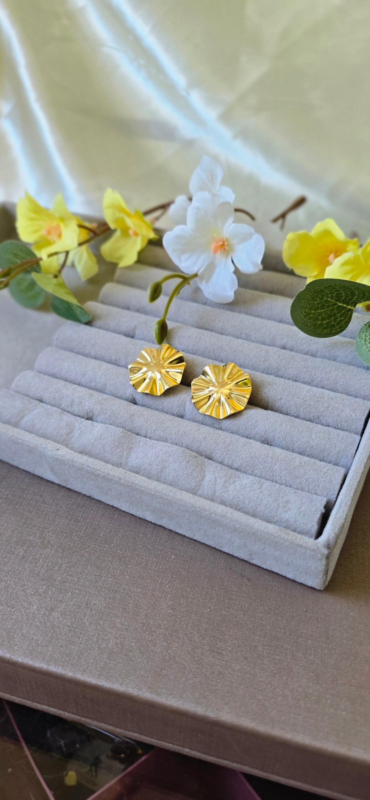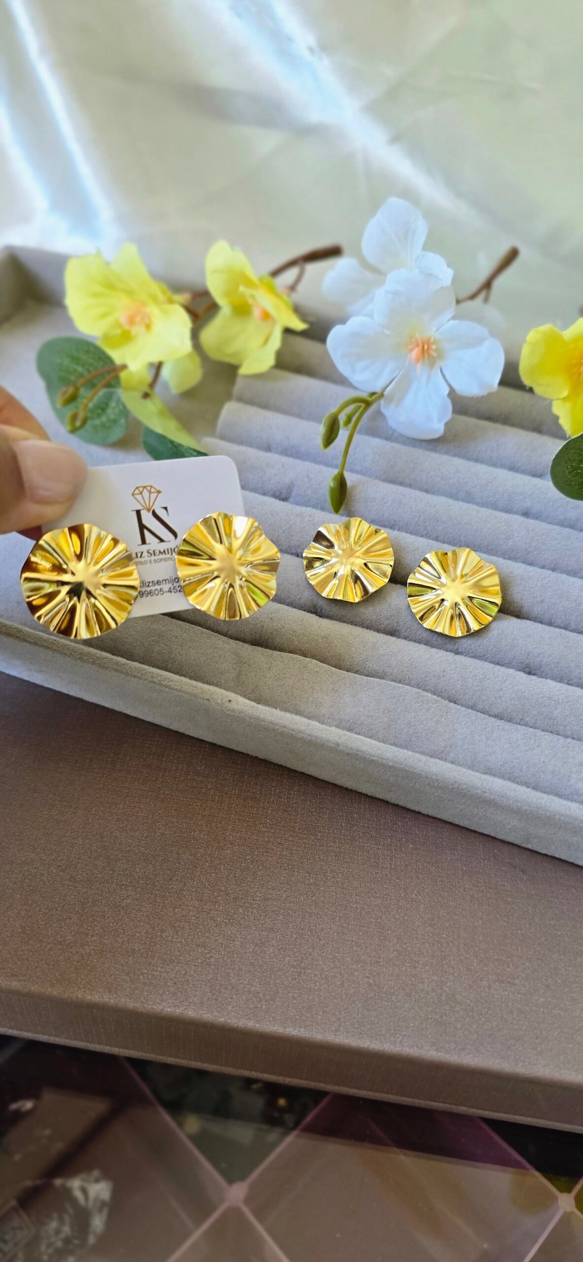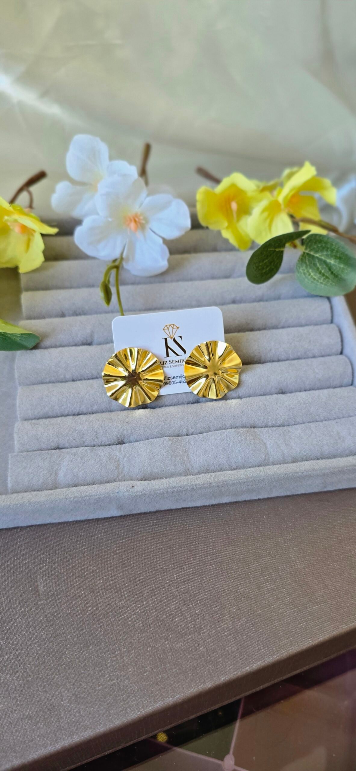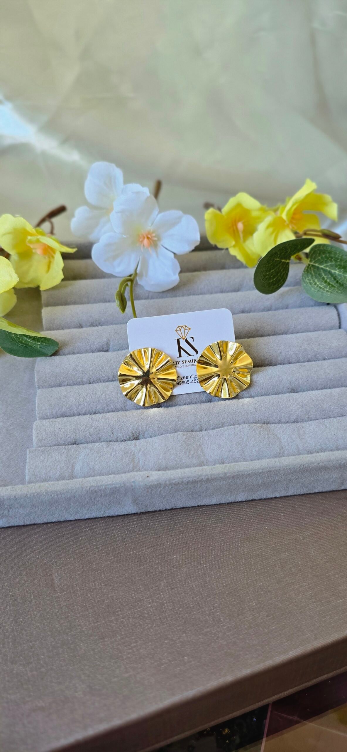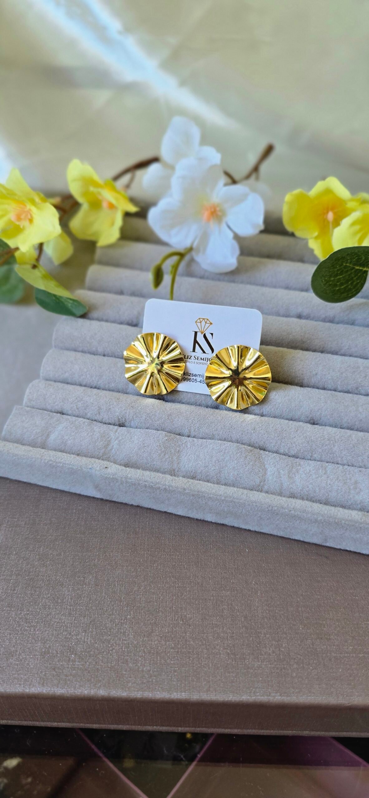 Com formato arredondado e textura marcante, ele une delicadeza e presença, sendo perfeito para iluminar produções do dia a dia ou compor looks mais elegantes.