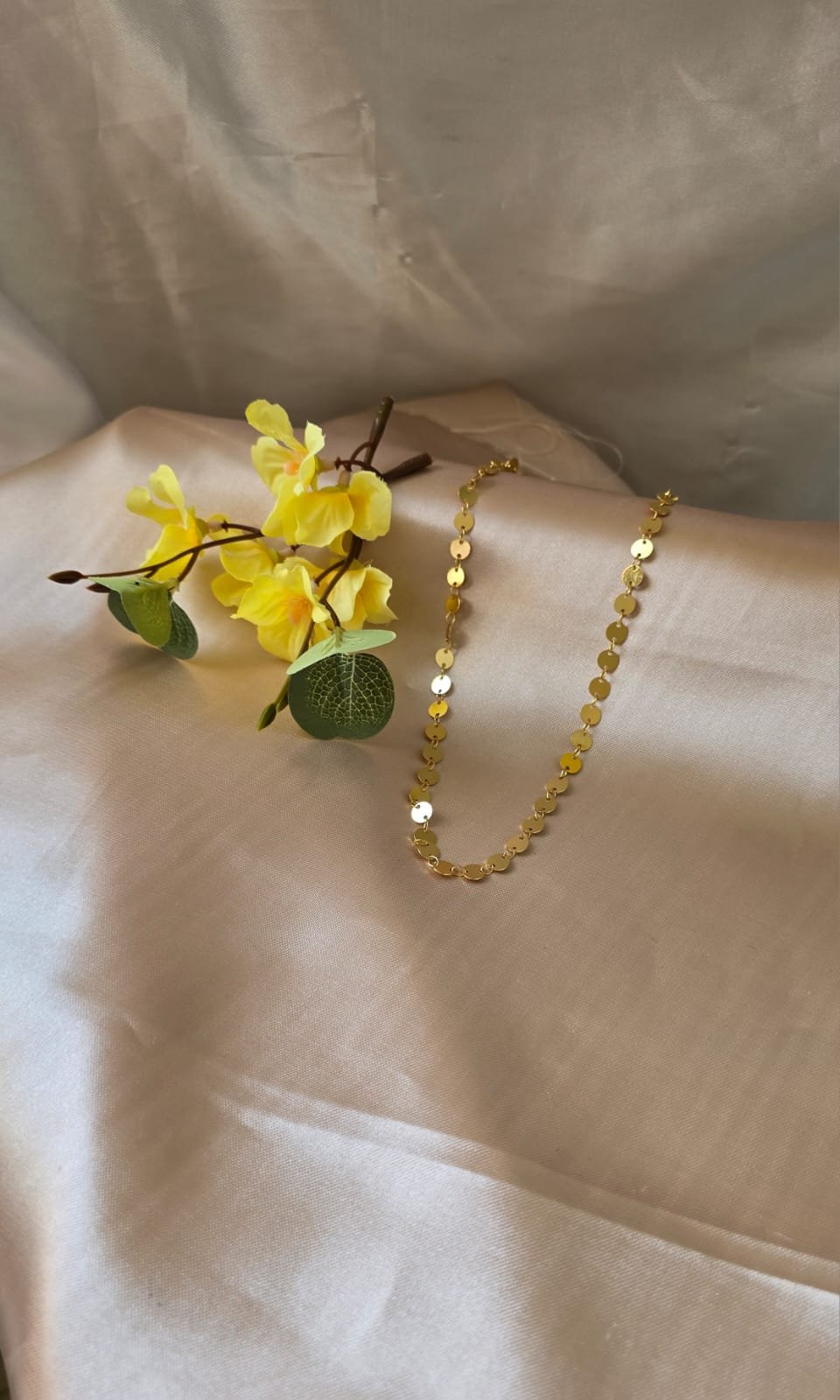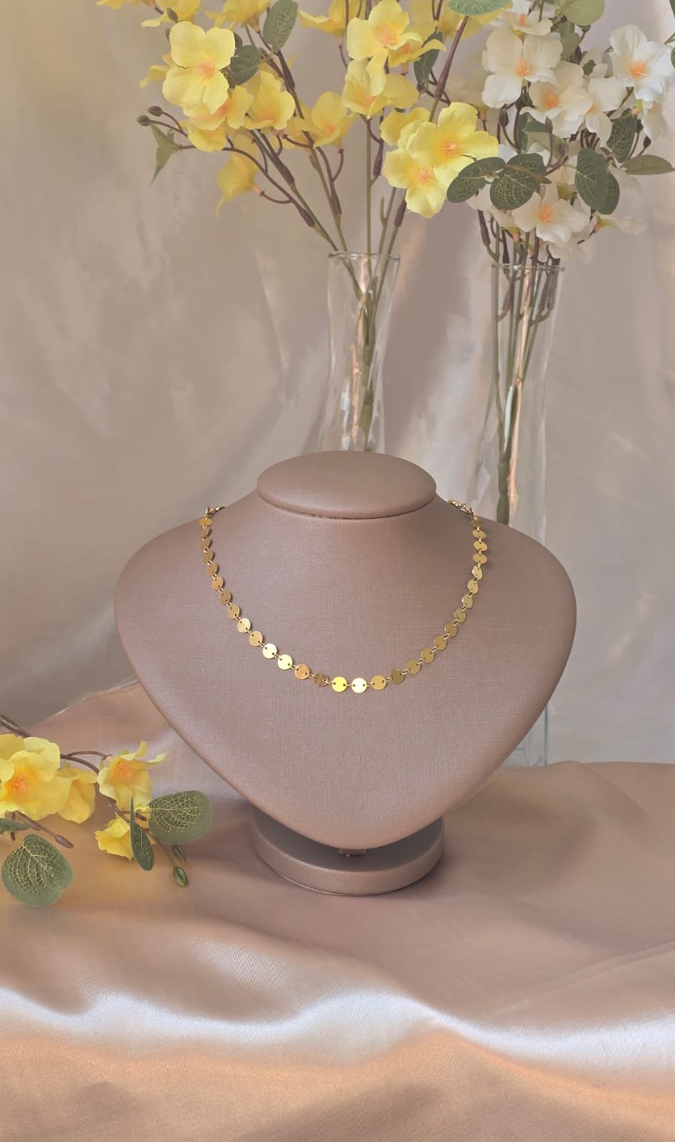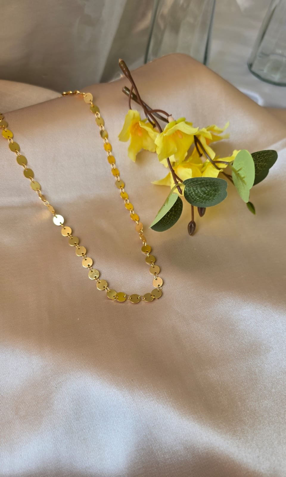 O colar ideal para quem ama elegância com delicadeza. Composto por medalhas lisas delicadamente interligadas, esse colar dourado possui um design moderno e atemporal, que reflete a luz com sutileza, garantindo um brilho sofisticado em qualquer produção.