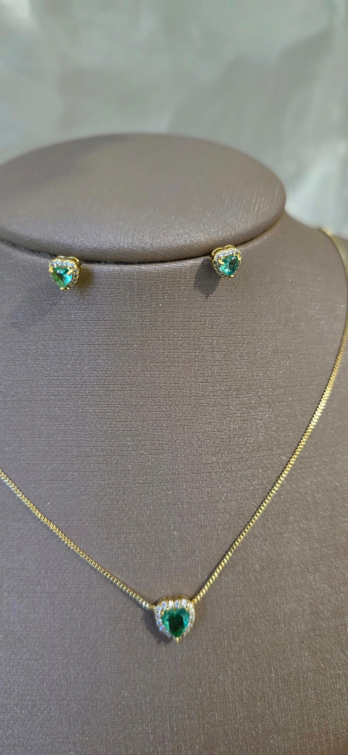 Colar e Brinco Coração Esmeralda Cravejado em Zircônias